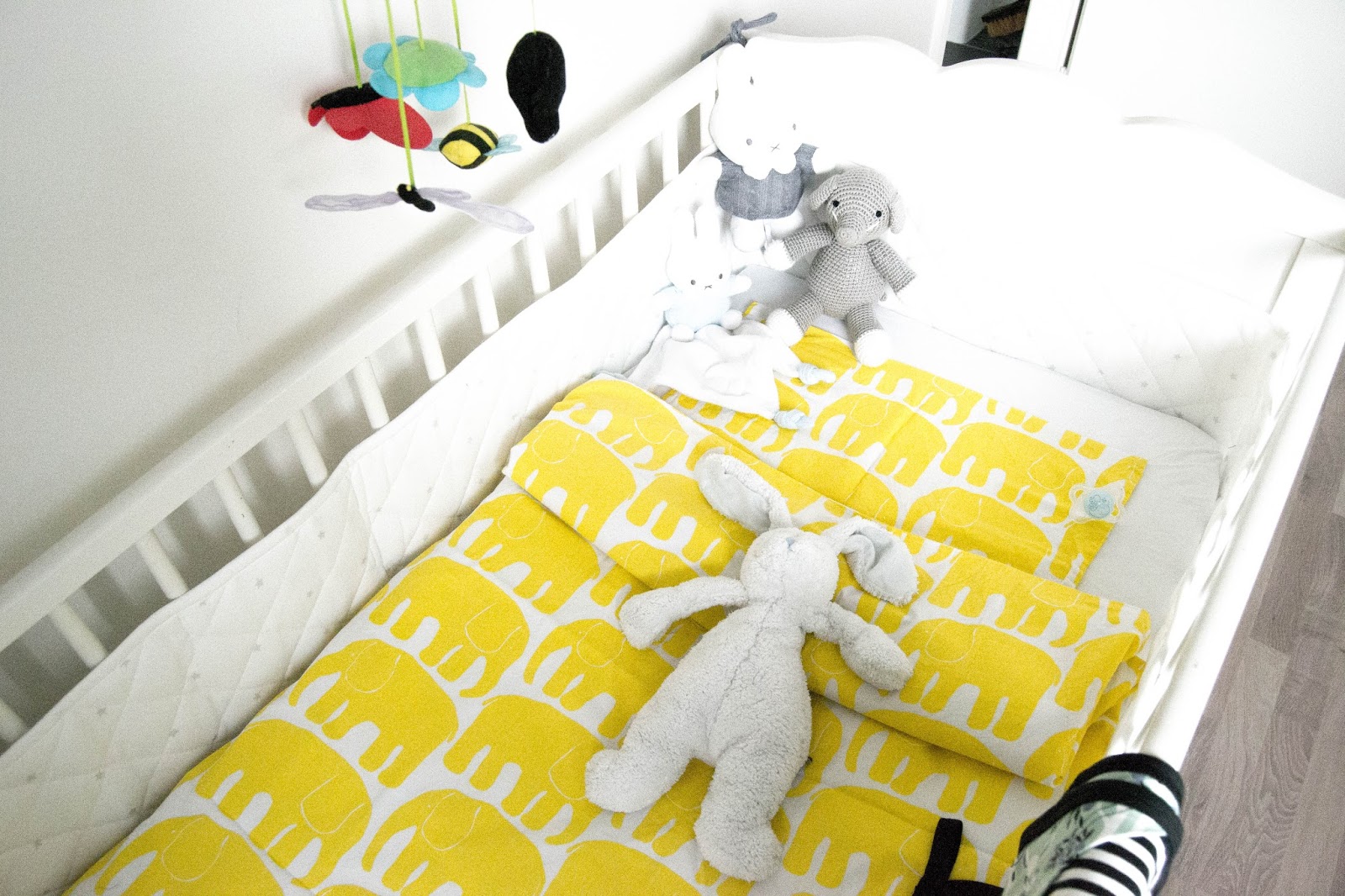Justuksen sänky on sama, joka Rasmuksella oli vauvana, välissä siinä on nukkunut lasten serkku ja nyt se on tehnyt taas paluun meille. Taattua Ikea-laatua. Vähän reunoissa on serkku-tytön hampaanjälkiä, mutta eihän se menoa haittaa! Reunapehmusteena on Ikeaa myös, toi pehmuste onkin kätevä, sillä se on yhdistetty pohjakankaalla. Eli alla on kangas, joka yhdistää reunapehmusteen alareunat yhteen. Patjana on Lastentarvikkeesta ostettu Trold ja Emman kosteussuojan päällä vielä Ikean petari. Lakanoissa oon suosinut aina niitä Ikean kuminauhareunallisia lakanoita, ne on vaan niin mahdottoman toimivia ja helppoja! Käytetään niitä myös omassa sängyssä.