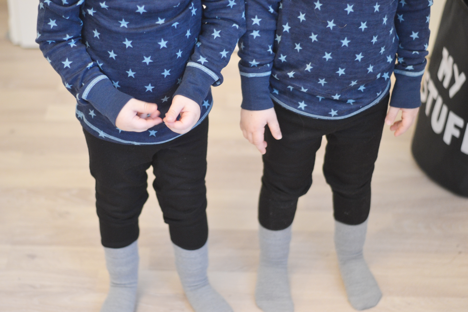 Kaikki lähtee aluspukeutumisesta. Ihoa vasten villaa, mieluiten merinoa, se kun ei kutita. Kuvissa lapsilla on päällä Lindexin paidat, Name itin leggarit ja Polarn o Pyretin sukat. Kaikki sukkia lukuunottamatta joulun alennusmyynneistä puoleen hintaan. Tälle kaudelle lapsille on kahdet setit, toinen kun on helposti pesussa tai muuten vaan teillä tietämättömillä. Toiset housut on Popilta ja ne on kyllä myöskin olleet laadultaan hyvät, sukissa vähän harmittaa nopea nukkaantuminen, en tiedä johtuuko meillä pesutavoista vai mistä, mutta varsinkin raitasukat veti nukalle ihan heti.