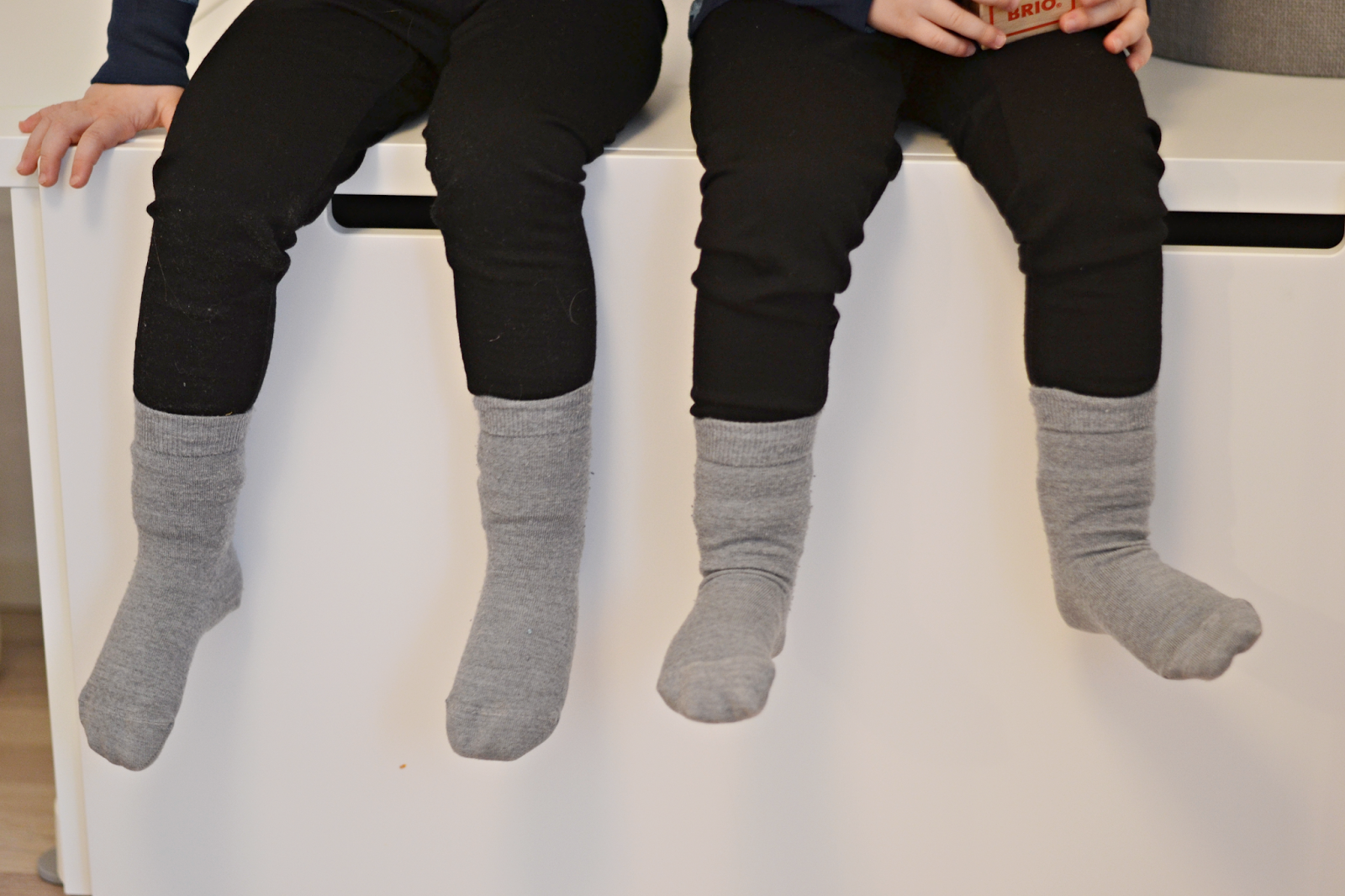 Kaikki lähtee aluspukeutumisesta. Ihoa vasten villaa, mieluiten merinoa, se kun ei kutita. Kuvissa lapsilla on päällä Lindexin paidat, Name itin leggarit ja Polarn o Pyretin sukat. Kaikki sukkia lukuunottamatta joulun alennusmyynneistä puoleen hintaan. Tälle kaudelle lapsille on kahdet setit, toinen kun on helposti pesussa tai muuten vaan teillä tietämättömillä. Toiset housut on Popilta ja ne on kyllä myöskin olleet laadultaan hyvät, sukissa vähän harmittaa nopea nukkaantuminen, en tiedä johtuuko meillä pesutavoista vai mistä, mutta varsinkin raitasukat veti nukalle ihan heti.